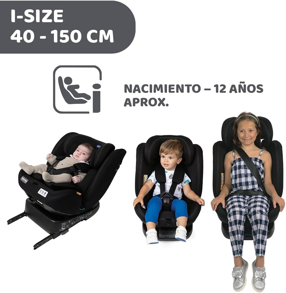 The Chicco i-Size evolutionary car seat is designed to grow with your child, providing safety and comfort from birth to age 12. This seat stands out for its ISOFIX and Top Tether system, ensuring easy and secure installation. The 360° rotation makes it easy to access and place your child.
