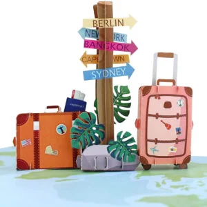 With an elegant exterior and a detailed design. When you open the pop-up card, a city sign with two suitcases on a world map unfolds.