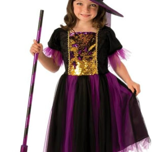 Corpiño con lentejuelasEl vestido de Bruja Mágica destaca por su corpiño de lentejuelas mágicas reversibles que cambian de color. Mangas abullonadas en satén negro con tul. Cierre de velcro trasero | Falda tul lilaLa falda del vestido esta hecha en tul morado y negro, combinados entre si. Lo que la convierten en una falda muy cómoda para la noche de Brujas **Las medias no están incluidas | Sombrero incluidoPara completar el disfraz, el sombrero es imprescindible y esta incluido. En color negro y con hebilla morada **La escoba no esta incluida |