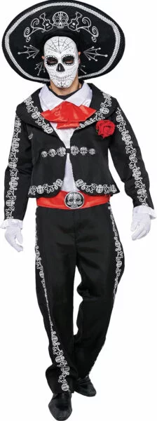 This complete costume is perfect for celebrating the Day of the Dead in style. The design includes authentic details like a jacket with sugar skull prints, a striking mask, and a characteristic hat to complete the attire.