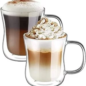 ecooe 2x350ml Tazas de Café de Cristal,Vasos de Doble Pared con Asa,Tazas de Vidrio Borosilicato para Té,Café,Leche,L...