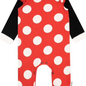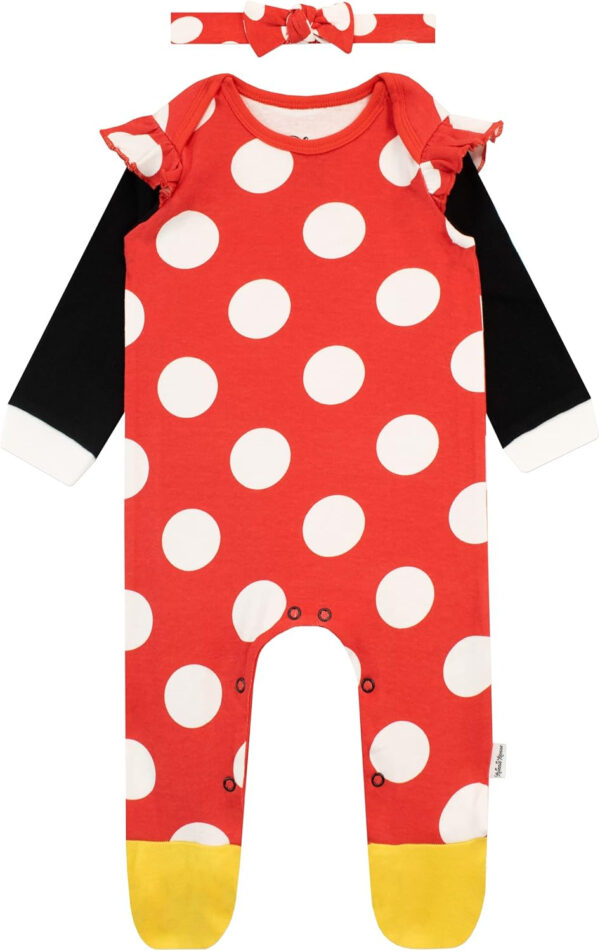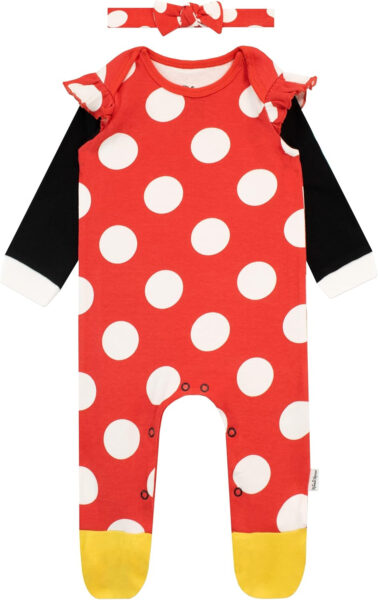Enterizo de Minnie Mouse con cintillo para bebé. ¡Tu ratoncita será la más bella con este enterizo! El atuendo imita el look de Minnie: rojo, puntos polka blancos y pies amarillos. Además, se completa con mangas negras y un hermoso cintillo con lazo para tener todo el estilo Minnie.