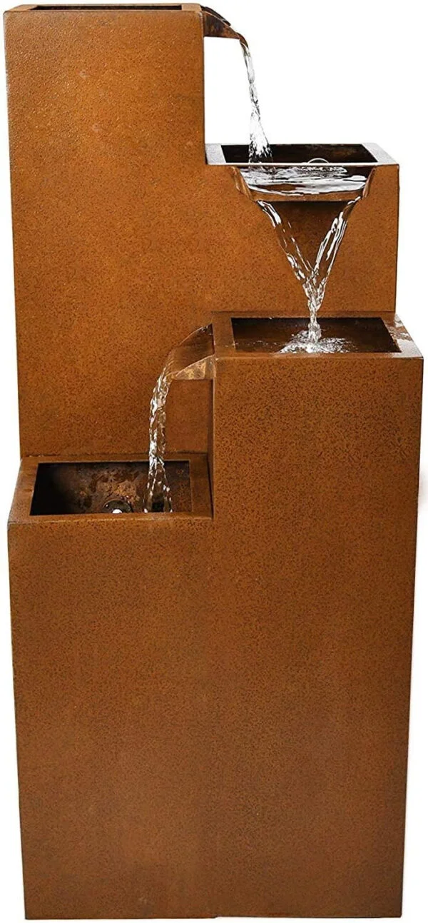 Esta fuente de acero corten es perfecta para quienes buscan añadir un toque de sofisticación a su terraza o jardín. Su diseño moderno y las luces LED integradas crean un ambiente mágico, especialmente al anochecer. Con un circuito de agua cerrado, garantiza un flujo continuo sin desperdicios.