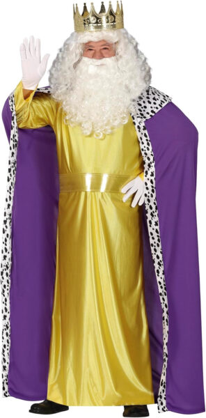 Este disfraz de rey mago amarillo y morado es para adultos. Tiene una túnica, una capa y un cinturón. La túnica larga del traje es de color amarillo dorado en toda su extensión. Un cinturón de oro brillante está presente para ceñir la túnica. La gran capa es de color púrpura con un borde blanco y negro que va desde la parte inferior de la túnica hasta la parte superior. Este disfraz de Rey Mago será perfecto para encarnar en estas fiestas!