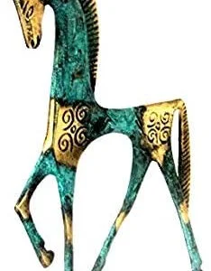 Estatua de museo de bronce griego antiguo, réplica de caballo de época geométrica. Código: 122. Dimensiones: 18 x 13 cm. Peso: 230 g. Material: bronce. Color: verde/oro. Oxidación. Esta es una réplica de estatua de museo hecha a mano de caballo de época geométrica hecha en Grecia, de 100% bronce utilizando el tradicional técnica «cera perd» tectectecque. Esta es la misma técnica utilizada por los antiguos griegos para crear esculturas de bronce y arsenal. El prototipo por el que fue hecho es una exhibición de museo. El color verde y dorado se da a través del proceso de oxidación