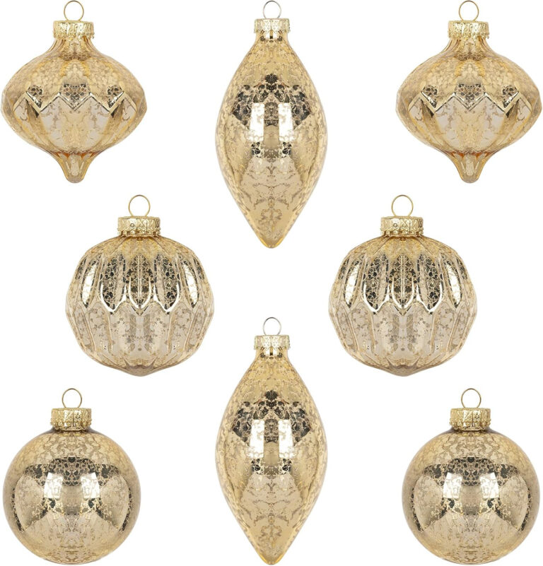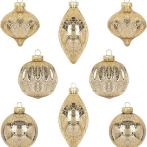 Un style ancien avec le verre marqué comme les miroirs au mercure, de jolis reflets dorés sans être clinquants. Ces boules sont fragiles puisqu’en verre mais tellement belles. Un charme suranné dans le sapin a coup sûr !!