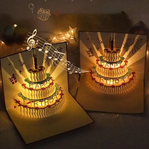 Esta tarjeta destaca por su diseño alegre y llamativo, combinando un pastel de cumpleaños tridimensional con luces brillantes y música festiva que suena al abrirla. Cada detalle del pastel está meticulosamente elaborado, creando una presentación que añade un toque de magia y alegría a tus felicitaciones. Además, su estructura robusta asegura que este recuerdo especial dure mucho tiempo, siendo un recuerdo precioso de un cumpleaños inolvidable.