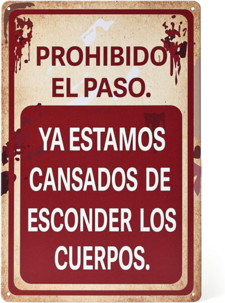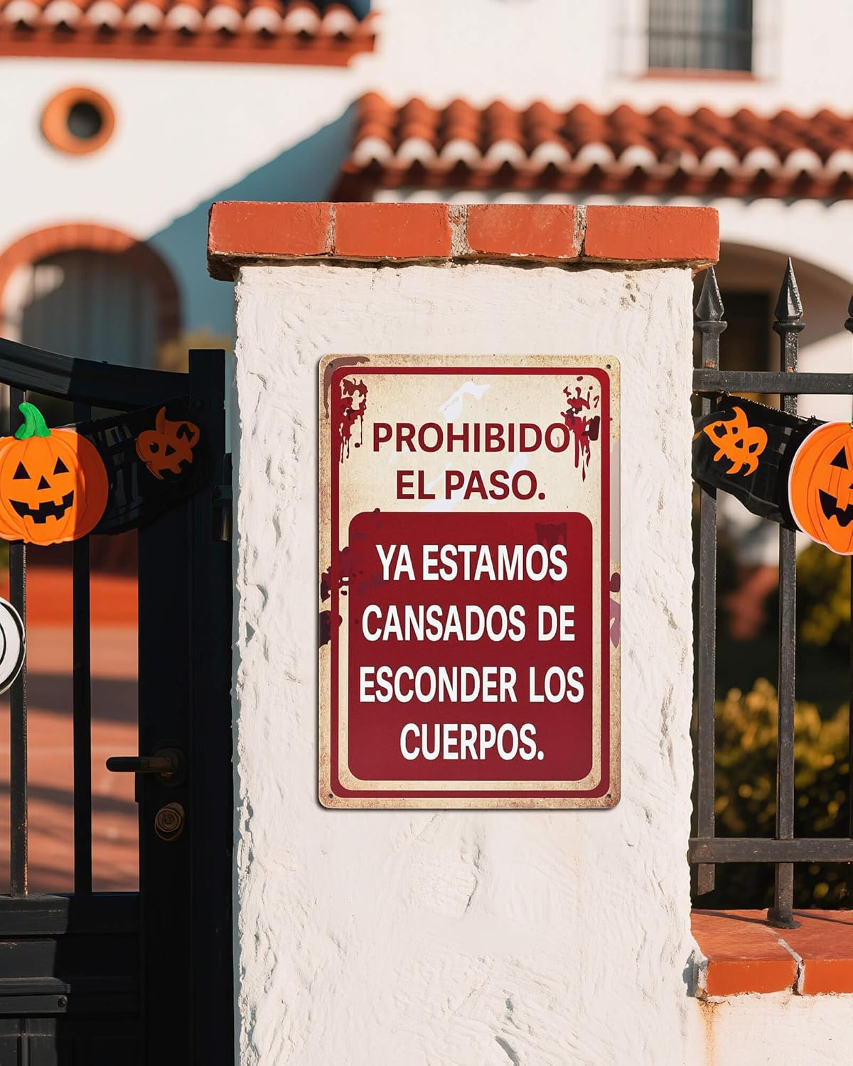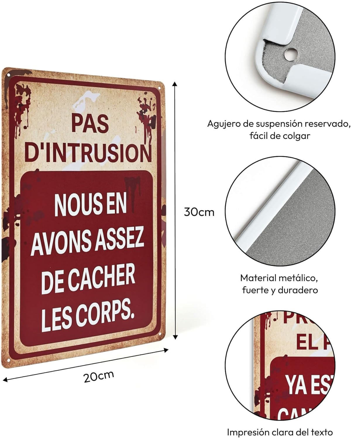 Dale un toque de humor negro a tu decoración de Halloween con este cartel metálico de 30 × 20 cm. Lleva impresa la frase «PROHIBIDO EL PASO. Ya estamos cansados de esconder los cuerpos», ideal para crear un ambiente espeluznante y divertido.