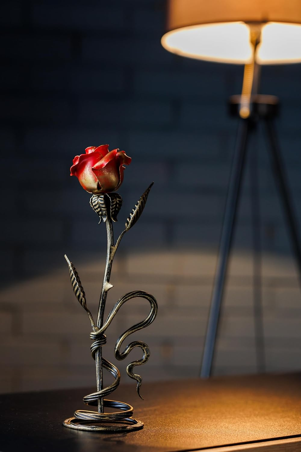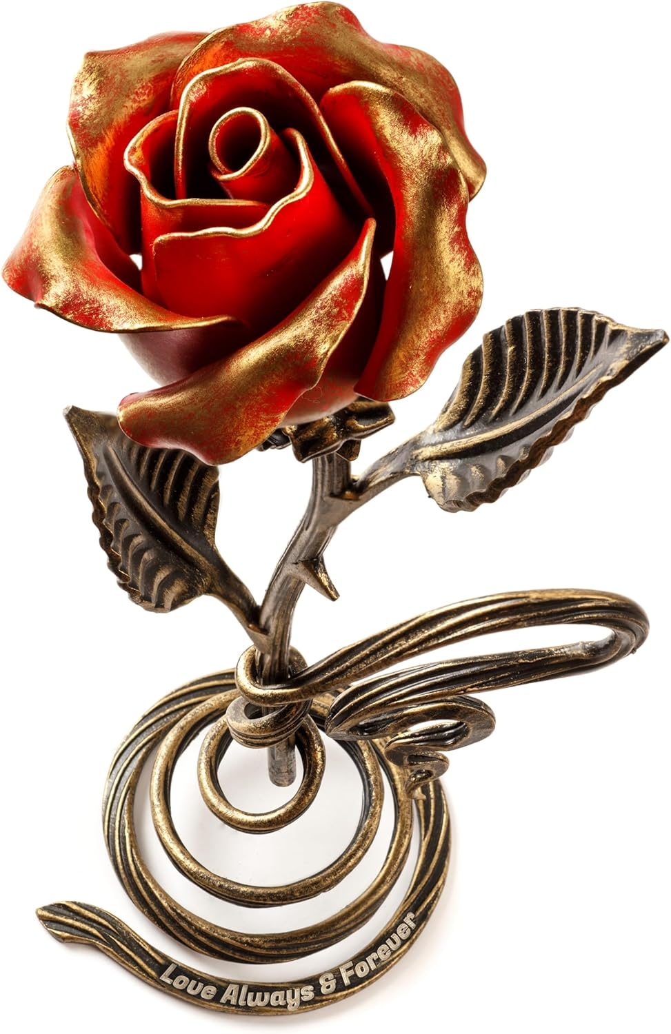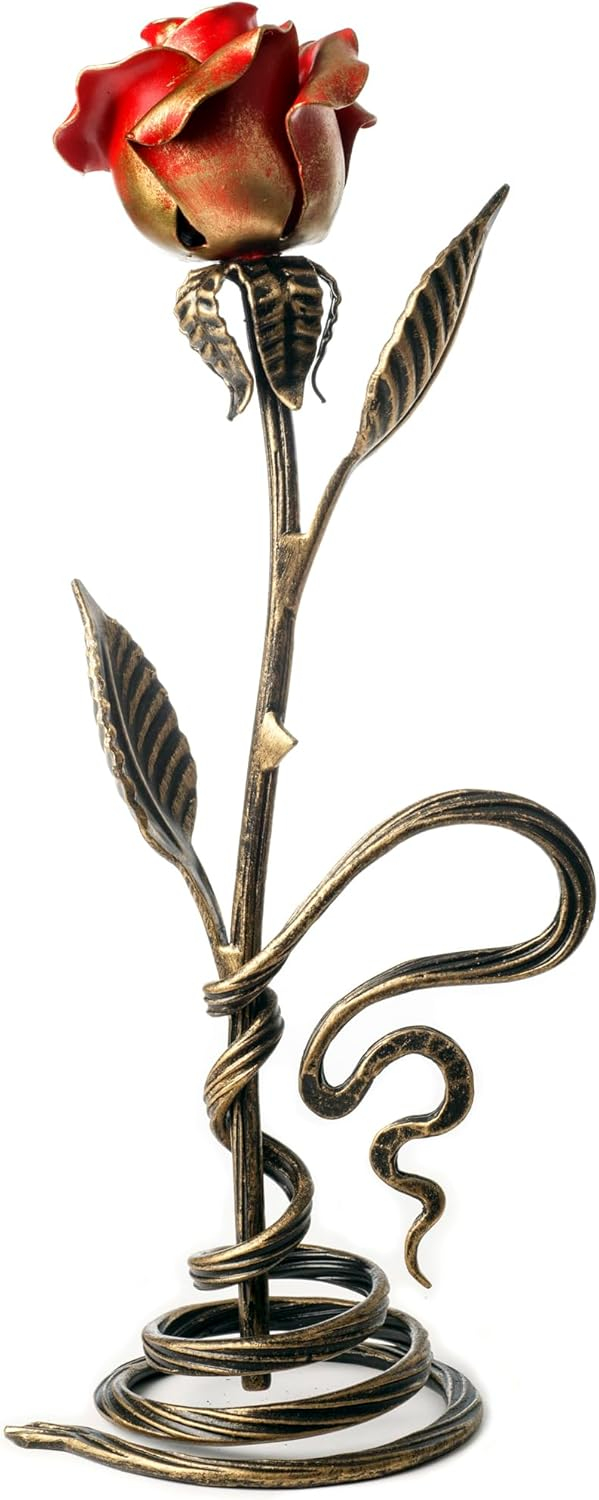 La escultura de metal mide aproximadamente 29 cm desde la parte inferior del tallo hasta la parte superior de la rosa.