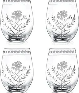 Jeoyan Soplado a Mano Copas de Vino Sin Tallo Grabadas,Copas de Vino Tinto o Blanco,Vasos de Vino con Motivos Florale...