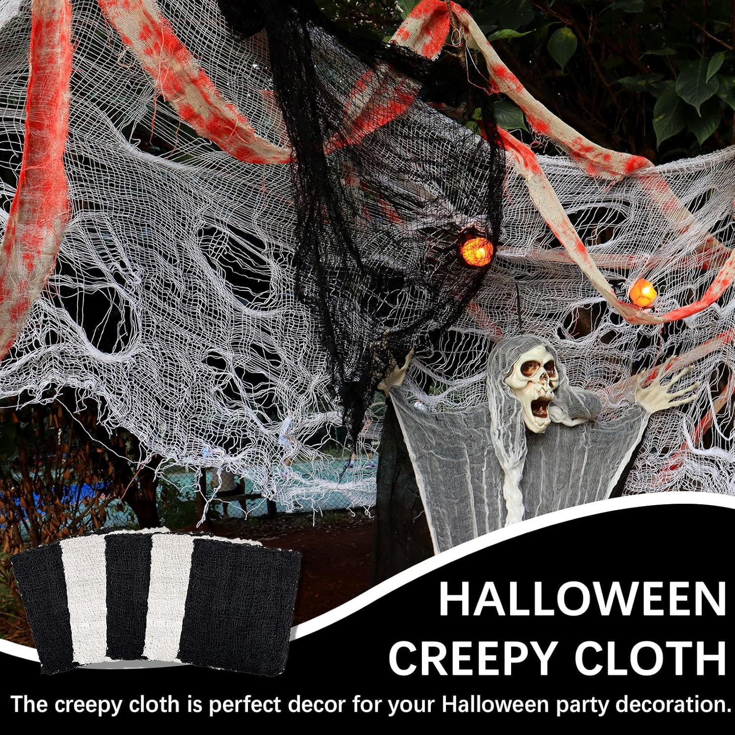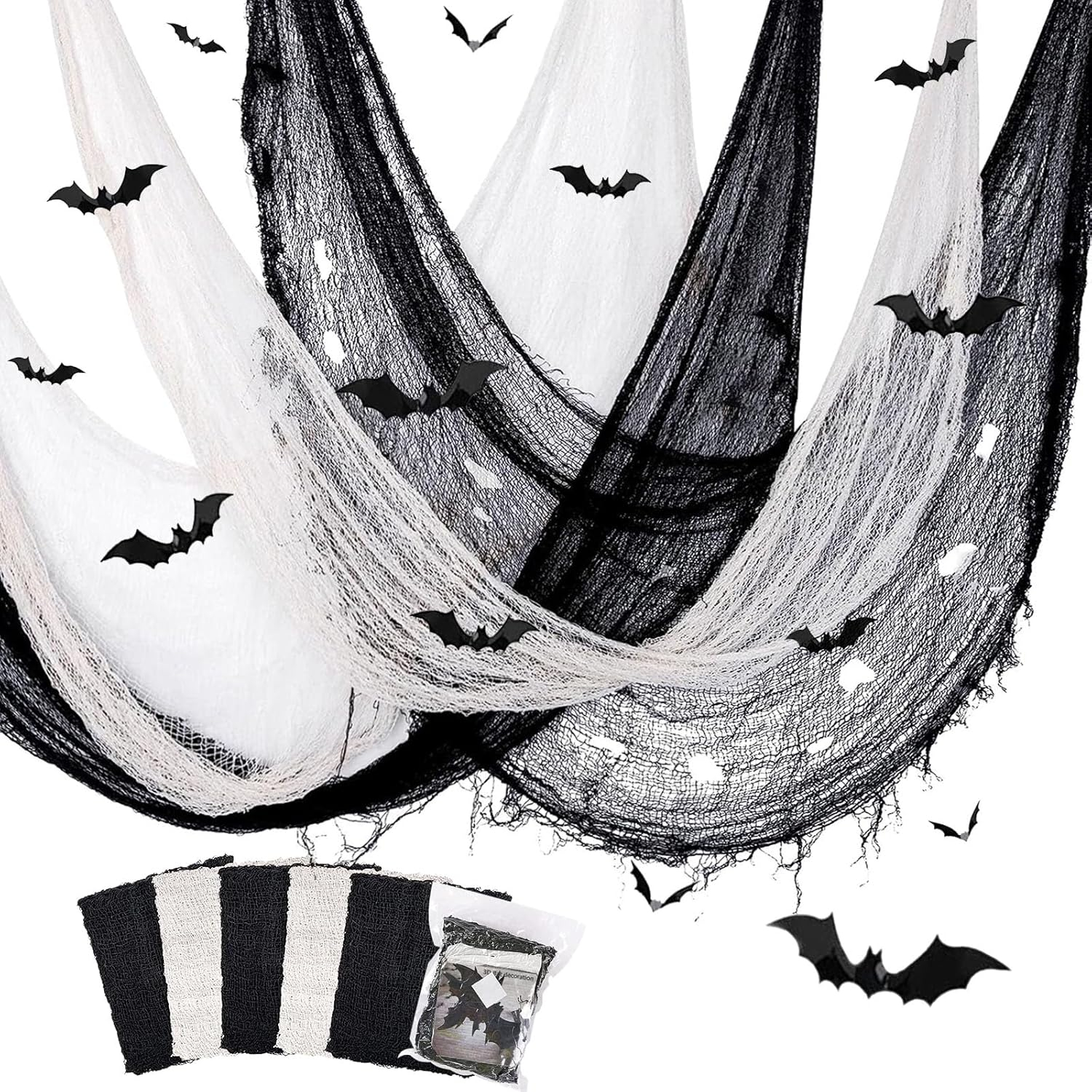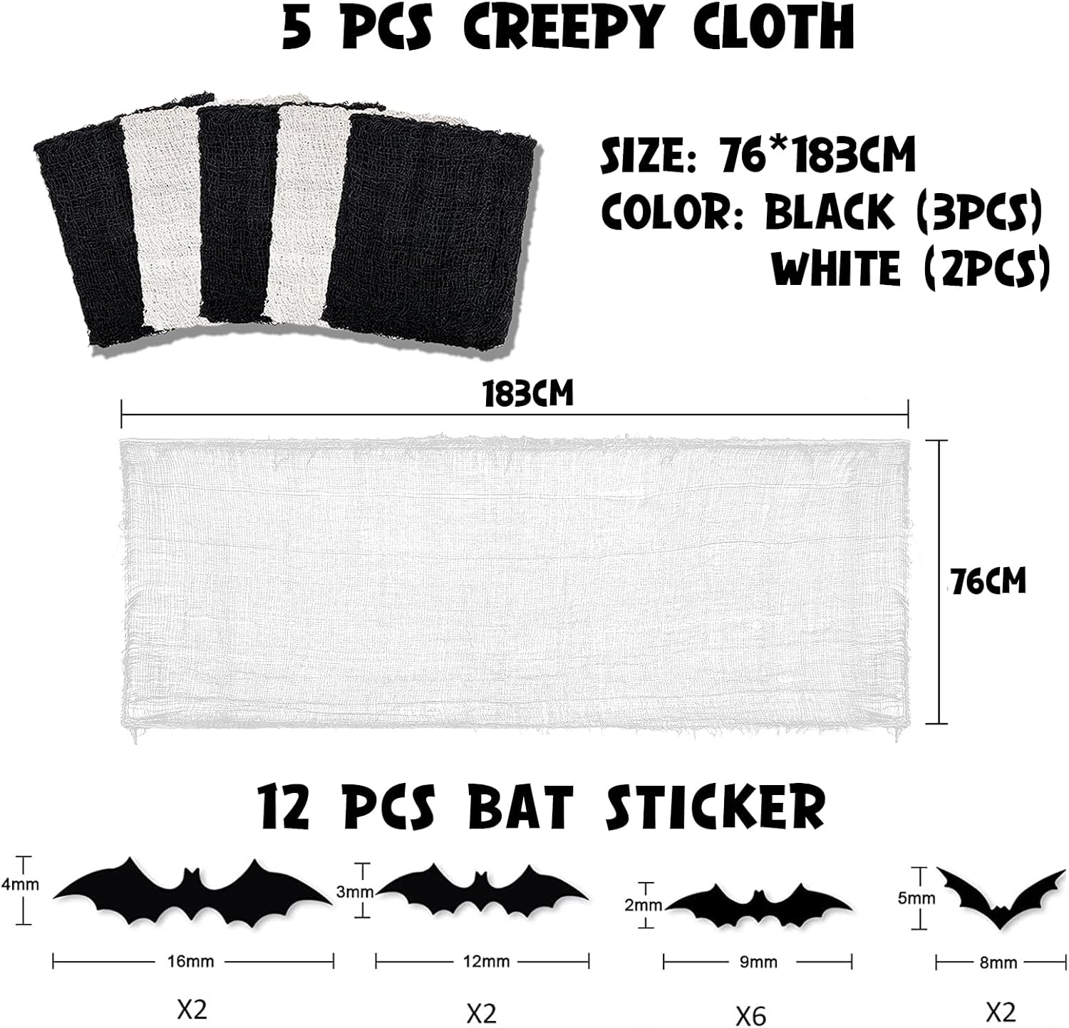 1 juego de 12 piezas de pegatinas de murciélagos voladores en 3D y viene con 3 piezas de tela negra aterradora y 2 piezas de tela blanca aterradora